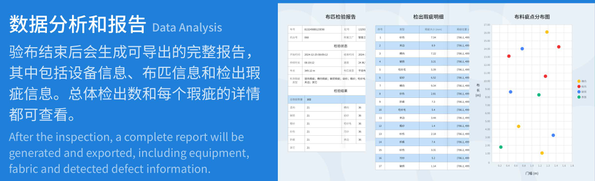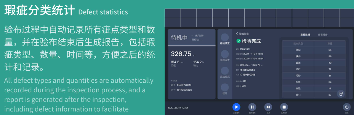 3. 智能化程度高:集成自动测量布宽、疵点检测、自动打标、对边、自动评分、报告生成等十余项工序,减少人工干预,降低劳动强度。依托人工智能+大数据技术,实现“越用越聪明”的自我优化,且所有检测信息自动储存,支持随时查询。具备瑕疵分类统计、数据分析、联网监控等附加功能,满足多样化需求。