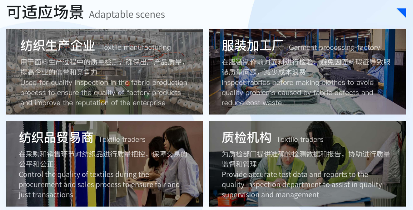2. 适配性极强:可检测平纹布、罗纹布、双面布、珠地布、毛圈布等多种面料。适配纺织生产企业、服装加工厂、纺织品贸易商、质检机构等多类主体的质量检测需求。自研多相机阵列同步成像技术,可快速无缝加装在现有普通验布机上,降低设备替换成本。