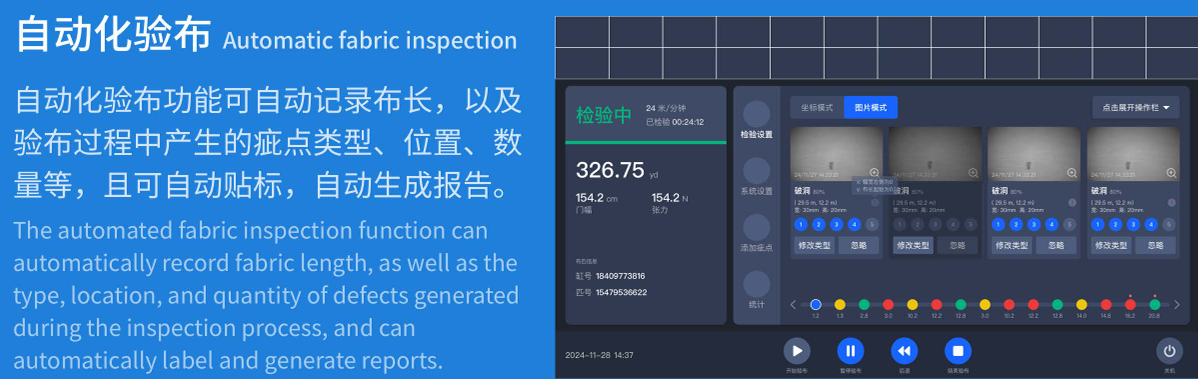 以人工智能与计算机视觉技术为核心,通过自研超高速、高稳定性工业级相机阵列实现同步成像,精准采集布面图像;依托高性能处理器,结合深度学习算法对图像进行实时分析,快速识别1.0mm及以上尺寸的各类布面瑕疵,同步完成疵点分类统计、位置记录、自动贴标等操作;验布结束后自动生成包含设备信息、布匹信息、疵点详情的完整可导出报告,形成“图像采集-智能识别-数据记录-报告生成”的全流程闭环,同时通过大数据积累持续优化检测模型性能。